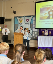This is a time for joy, celebration, forgiveness, and reconciliation, as well as a time to renew hope and offer it to others. During the worship, we said prayers and sang the jubilee song which were linked to this year of hope for a world suffering the impacts of war, the ongoing effects of COVID-19 pandemic, and the climate crisis. At the end, the pupils from St Ignatius handed over the ‘pilgrimage of Hope’ banner to our children where we attached our school badge to the numerous others from the schools it had already visited. We then placed the banner in our dance studio where each year group took it in turns to visit and hold their own worship and prayer time. Then on Friday, at the end of mass, it was our turn to pass the banner onto St John Fishers so that it could continue on its journey as part of Pope Francis‘ pilgrimage of hope.