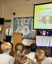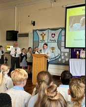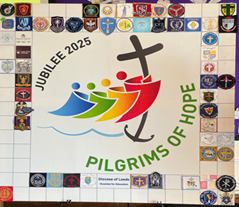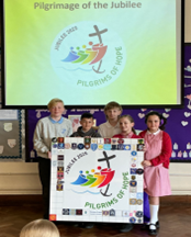 This is a time for joy, celebration, forgiveness, and reconciliation, as well as a time to renew hope and offer it to others. During the worship, we said prayers and sang the jubilee song which were linked to this year of hope for a world suffering the impacts of war, the ongoing effects of COVID-19 pandemic, and the climate crisis. At the end, the pupils from St Ignatius handed over the ‘pilgrimage of Hope’ banner to our children where we attached our school badge to the numerous others from the schools it had already visited. We then placed the banner in our dance studio where each year group took it in turns to visit and hold their own worship and prayer time. Then on Friday, at the end of mass, it was our turn to pass the banner onto St John Fishers so that it could continue on its journey as part of Pope Francis‘ pilgrimage of hope.
