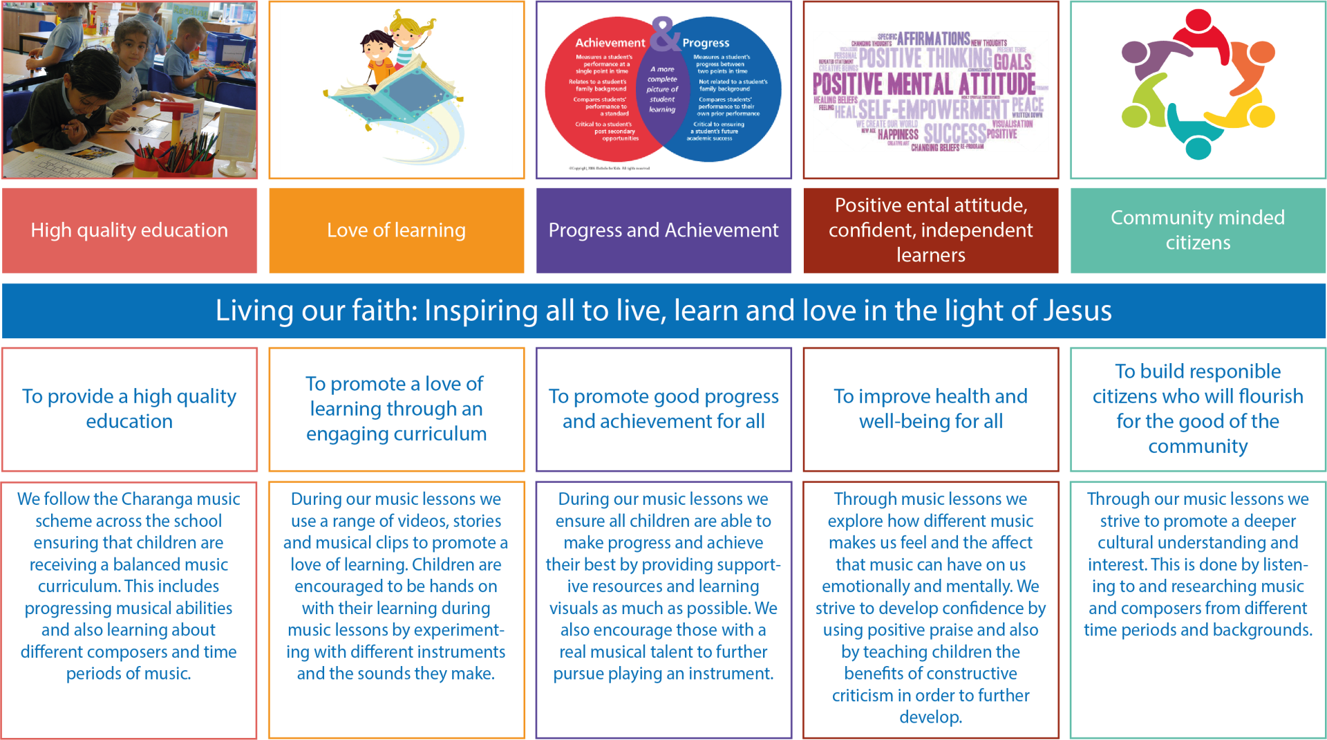 Our aim is to make music a fun, lively and interesting lesson using a range of instruments and tools to make it a hands on experience. We also look at music through worships and understanding that we are celebrating God’s presence in our lives. We recognise that music is an opportunity for many children to showcase their own musical talents and achieve their full potential. Through the music scheme, children will compare and look at a range of musical genres from a range of cultures; this will develop their respect for other cultures. Children with Educational Needs will be able to thrive in music lessons, as they will be able to express themselves in ways they cannot in core subjects. They will be taught through a hands on and lively approach, ensuring that they are engaged throughout.