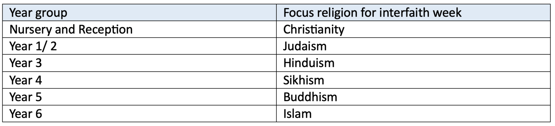 We teach each world faith separately, and include visits from people of other faiths or visits to places of worship where possible. We actively look at the similarities and differences between religions so that we can learn from one another and grow to appreciate that we are all part of God’s creation.