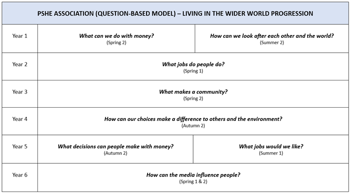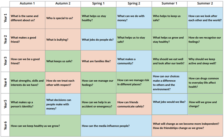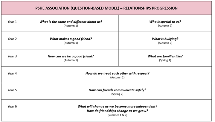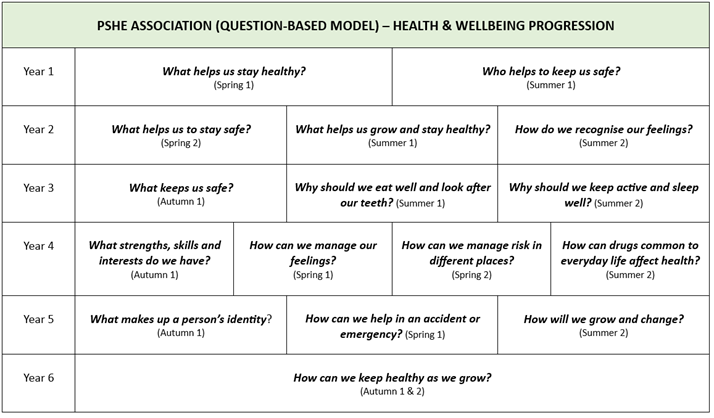 We use the PSHE Association ‘Question-based Model’. This programme builder is structured around an overarching question for each term or half term. These begin in Key stage 1 as ‘What? and ‘Who?’’ questions and build throughout Key Stage 2 into ‘Why?’ and ‘How?’ questions.