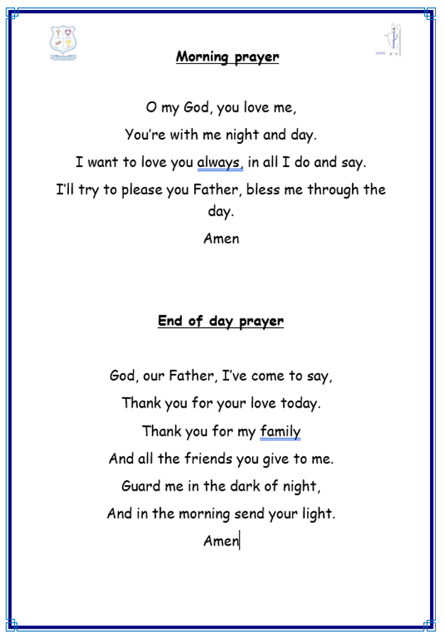Each day begins and ends in prayer in class. Some of the prayers we say are listed below. We also say grace before lunch to thank everyone for the food we are about to eat and after lunch when we come back to class.