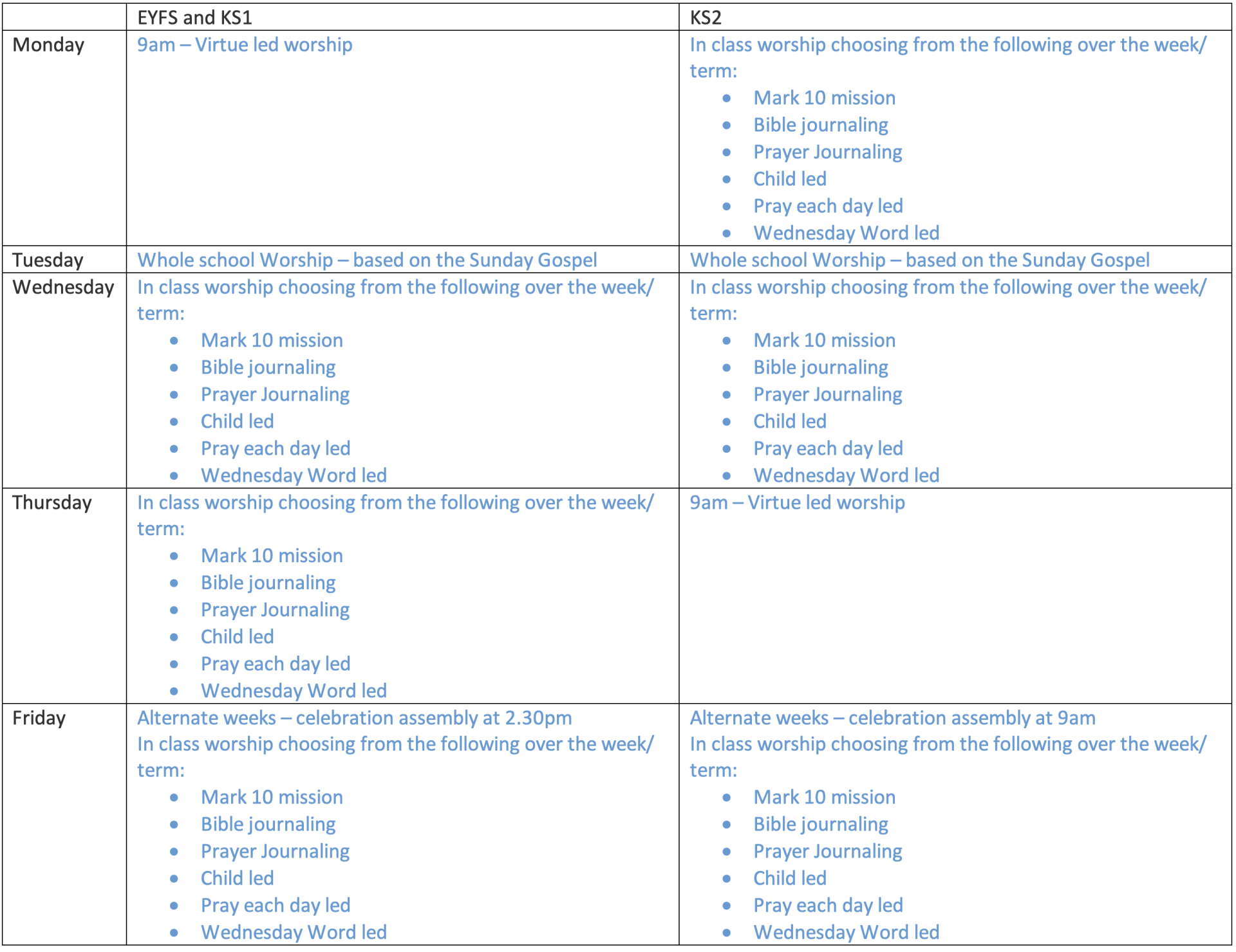 Over the week, each key stage experiences a key stage virtues led worship and then the whole school gathers together on a Tuesday to share the Gospel from Sunday mass. Staff and children experience different forms of prayer over the week and term so that they can all engage with this special time in their own ways. School uses the following resources to enable prayer: Mark 10 mission, prayer journaling, bible journaling, pray each day by Pat Ainge and the Sunday gospels. Child led worship is important to us and we engage in a strong developmental programme designed by the Trust to encourage pupils to develop their leadership in this area.