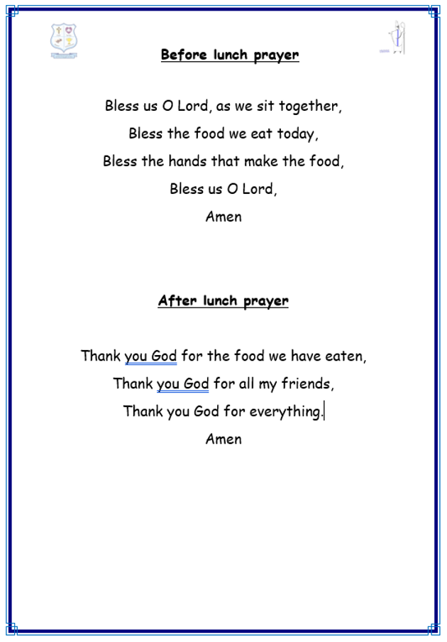 Each day begins and ends in prayer in class. Some of the prayers we say are listed below. We also say grace before lunch to thank everyone for the food we are about to eat and after lunch when we come back to class.