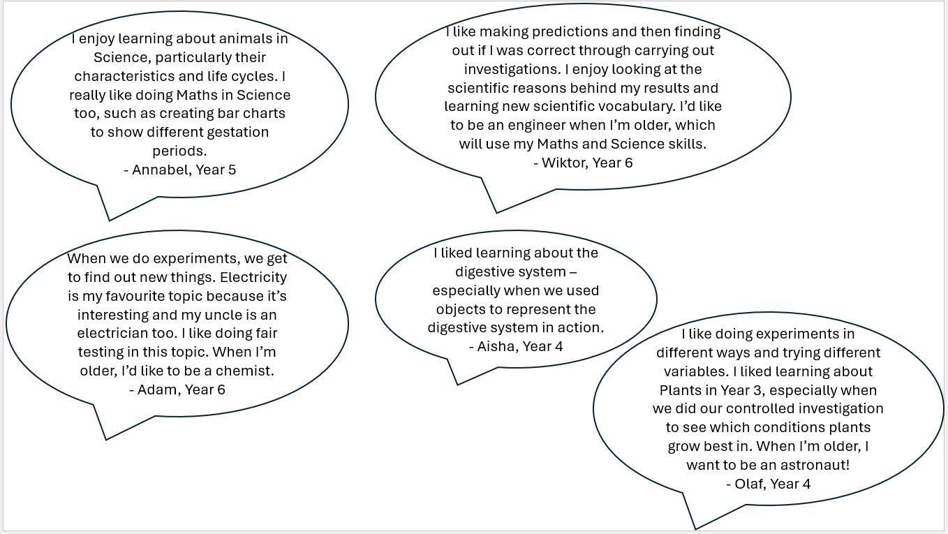 You can see some of the impact of our curriculum in the work at the top of the page. We also have some quotes from our children when asked about Science lessons here at St Paulinus.
